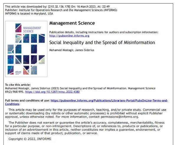 原文:Mostagir, M and Siderius, J. (2023). Social Inequality and the Spread of Misinformation. Management Science 69(2):968-995.