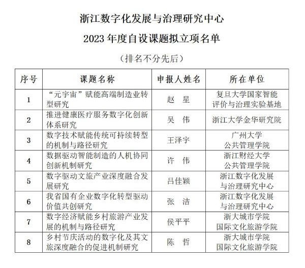 根据《关于开展2023年度浙江数字化发展与治理研究中心自设课题招标的通知》,经个人申报、专家评审,现将浙江数字化发展与治理研究中心2023年度自设课题名单予以公示。公示期为2023年4月18日-25日。到期后如无特殊情况,公示项目自然立项。